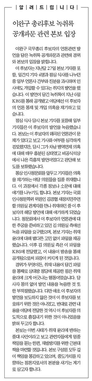 그러나 기자가 공인인 이 후보자 발언을 녹음한 사실 자체는 문제될 것이 없으며, 취재윤리 위반보다 한국일보가 총리 후보자의 잘못된 언론관을 확인하고도 보도하지 않은 것이 더 문제라는 비판이 나온다. 한국일보의 한 중견기자는 “중도지라는 한국일보 정체성에 심각한 타격을 입었다”고 했다. 최근 희망퇴직 실시와 편집국 인사로 한 차례 홍역을 치른 한국일보가 이번 위기를 어떻게 타개해 나갈지도 주목된다. 한국일보 새 경영진은 법정관리 졸업과 동시에 강행 실시한 희망퇴직과 편집국 ‘부당인사’ 논란으로 기자들의 거센 반발을 샀다. 갈등이 고조되자 사측은 유감을 표명하며 한 발 물러섰다.