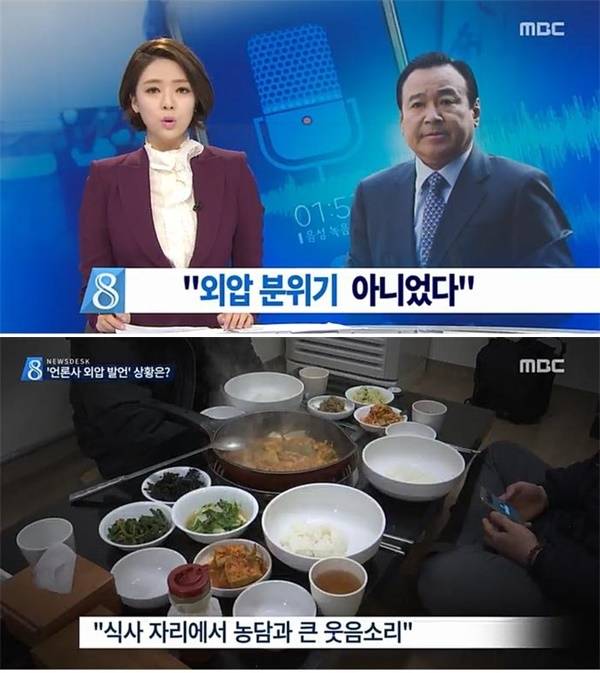이 총리 후보자의 인사청문회가 진행된 10~11일 MBC 뉴스데스크는 ‘이완구 감싸기’에 급급했다. 친분있는 언론사 간부에 전화를 걸어 기사를 내리고 인사에 개입할 수 있다는 발언에 이어 자신이 언론인을 대학 총장으로 만들어줬다거나 김영란법을 통과시켜서 기자들도 검경에 불려가 당해봐야 한다는 등의 발언이 11일 추가로 공개됐지만 뉴스데스크는 10번째로 “외압 분위기 아니었다”는 제목의 리포트를 내보냈다. 이 후보자가 4명의 기자들과 식사했던 당시 분위기에 대해 “농담과 큰 웃음소리가 오간 분위기였다”는 식당 관계자 인터뷰와 “다소 과장된 표현으로 농담을 섞어 한 말”이라는 총리실 관계자들의 말을 전했다. “야당 측이 추가 공개한 녹음 파일에서 웃음소리가 들렸다”며 “같이 식사했던 기자들도 해당 발언이 받아넘길 수준이라 외압으로 느끼지 않았는데 보도가 나와 당혹스러워 한 것으로 전해졌다”고 보도했다.