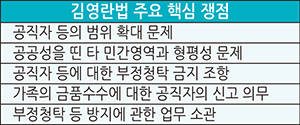 가족의 금품수수에 대한 공직자의 신고의무도 도마에 올랐다. 가족 금품수수시 공직자에게 신고 의무를 부과했는데, 형법에서 친족은 ‘범인은닉죄’의 제외대상이기 때문에 법 충돌이 불가피할 수밖에 없다.