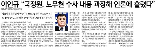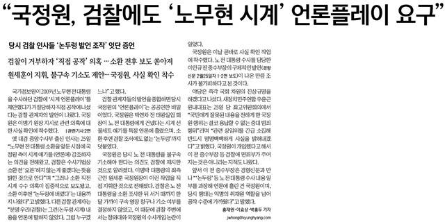 경향신문은 지난 25일 ‘이인규 “국정원, 노무현 수사 내용 과장해 언론에 흘렸다”’라는 제목의 1면 톱기사에서 2009년 검찰이 노무현 전 대통령을 수사할 당시 국정원이 ‘언론 플레이’를 했다는 이인규 전 대검찰청 중앙수사부장의 증언을 보도했다.