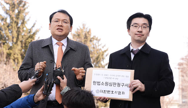 대한변협은 지난 5일 서울 종로구 헌법재판소에 헌법소원청구서를 제출하며 “김영란법 제정 취지에는 공감하지만 위헌 요소가 있고 정당성의 문제가 있어 헌법소원 심판을 청구하게 됐다”고 밝혔다. 청구인은 한국기자협회와 강신업 대한변호사협회 공보이사, 박형연 대한변협신문 편집인 등이다.