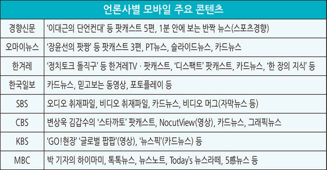 이미지나 영상을 활용한 콘텐츠는 모바일에서 특히 수요가 높다. 가독성이 떨어지는 모바일 환경에서 시각적인 효과를 통해 짧은 시간 내 이슈를 쉽게 파악할 수 있다는 장점이 있기 때문이다. 10장 내외의 이미지와 간결한 텍스트로 구성된 카드뉴스는 지난해 말부터 SBS를 필두로 경향신문(반짝뉴스), 연합뉴스, 조선일보, 한국일보, 한겨레, CBS(한컷뉴스), KBS(뉴스픽) 등 각 언론사에서 앞다퉈 시도하고 있다. 네이버에는 ‘카드로 보는 뉴스’라는 제목으로 각 사 카드뉴스를 한데 볼 수 있는 코너도 있다.