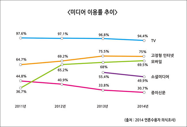 한국언론진흥재단이 지난해 발표한 ‘2014 언론수용자 의식조사’에 따르면, 1993~2014년 미디어 이용률 변화 추이는 모바일을 통한 인터넷 이용률만이 증가세를 보였다. 모바일 이용률은 2010년 31.3%에서 69.5%로 지속적인 상승세였고, 소셜미디어 이용률은 49.9%로 조사대상 2명 중 1명이 이용하는 것으로 나타났다.(조사대상 19세 이상 5061명, 대인면접조사) 언론사 디지털 관계자들은 “정해진 답은 없다. 미디어 환경 변화에 따라 콘텐츠와 플랫폼 등 다양한 개발을 시도할 수밖에 없다”고 입을 모았다.