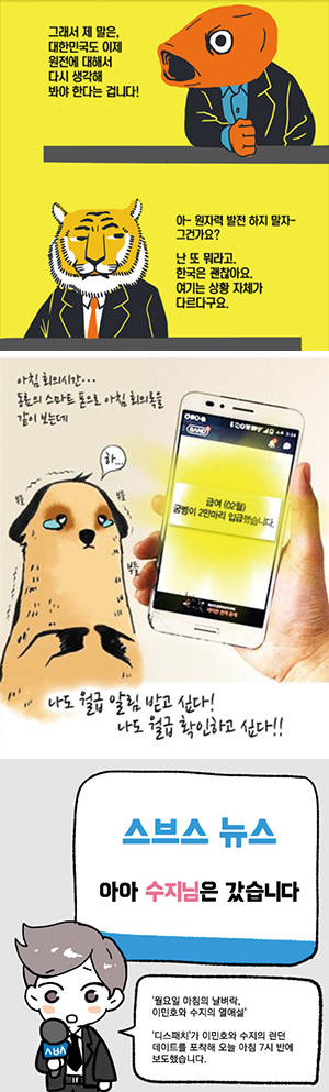 경향신문이 앞서 지난해 12월 선보인 디지털스토리텔링 ‘원전회의록’은 뉴스와 웹툰이 결합한 성공적인 사례 중 하나다. 핵발전소 존폐를 두고 동물들이 원탁회의를 하는 장면을 웹툰과 인포그래픽으로 구성했는데, 방대하면서도 전문적인 원전 관련 지식을 만화라는 형식으로 이해하기 쉽게 풀어냈다는 평가를 받았다.