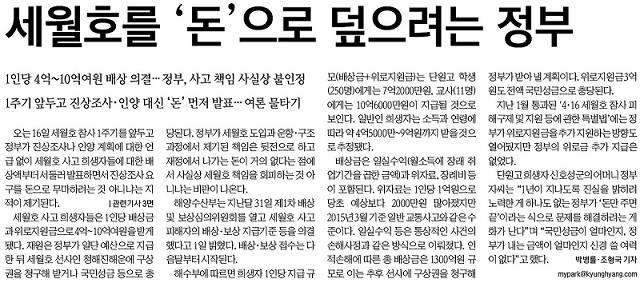 경향은 3면 머리기사에서도 “세월호 참사 1주기를 앞두고 정부가 희생자 가족들에게 내놓은 것은 돈이었다. 유가족들이 진상규명을 위해 꾸준히 요구해온 선체 인양 계획에 대해선 언급이 없었다. 세월호 참사 특별조사위원회는 관련 법이 국회를 통과한 지 반 년이 다 되도록 출범조차 못하고 있다”고 지적했다. 경향은 “정부가 1일 내놓은 배상 계획은 박근혜 정부가 세월호 참사를 관재(官災)가 아니라 단순한 교통사고로 인식하고 있음을 단적으로 보여준다”며 “실종자 9명이 여전히 돌아오지 못한 상황에서 정부가 세월호 참사의 실체를 외면하고 있다는 비판이 제기되는 이유”라고 꼬집었다.