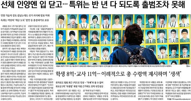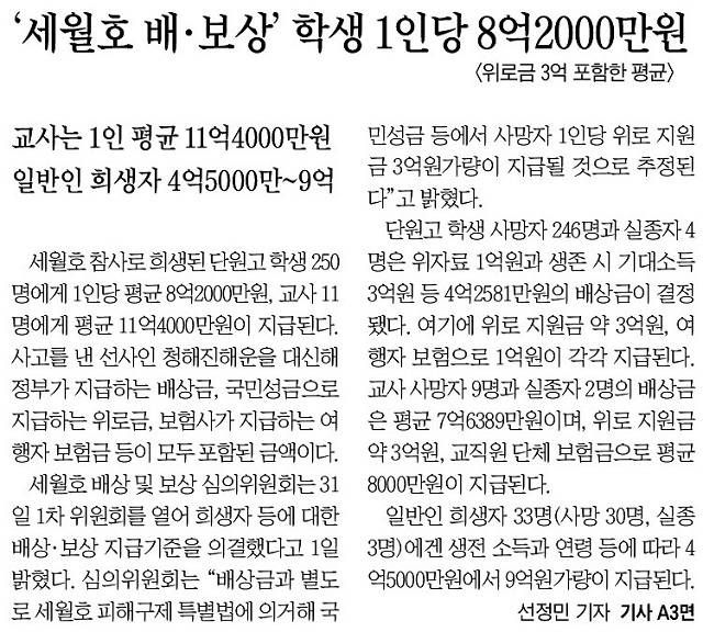 조선일보는 2일 1면 상단 기사에서 “세월호 참사로 희생된 단원고 학생 250명에게 1인당 평균 8억2000만원, 교사 11명에게 평균 11억4000만원이 지급된다”고 보도했다. 조선일보 1면에 ‘세월호’ 세 글자가 등장한 것은 지난 3월1일 이후 세 번째였다. 이전 두 차례는 박근혜 대통령의 세월호 참사 당일 행적에 의문을 제기한 일본 산케이신문 보도에 대해 법원이 허위라고 판결했다는 지난달 31일자 기사와 같은 달 16일 세월호 트라우마에 짓눌린 해경이 짙은 안개 속에 헬기를 띄웠다가 사고를 냈다는 38자짜리 ‘팔면봉’ 뿐이었다.