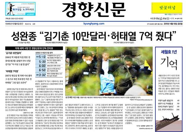 경향신문은 10일 1면 톱기사를 통해 “성 전 회장(새누리당 전 의원)이 김기춘 전 청와대 비서실장에게 미화 10만달러를, 2007년 한나라당 대선후보 경선 때 허태열 전 비서실장(당시 캠프 직능총괄본부장)에게 현금 7억원을 전달했다고 말했다”고 밝혔다. 성 전 회장은 9일 오전 법원의 영장실질심사에 불참했고 오후 3시32분쯤 북한산 형제봉 매표소 인근에서 숨진 채 발견됐다.