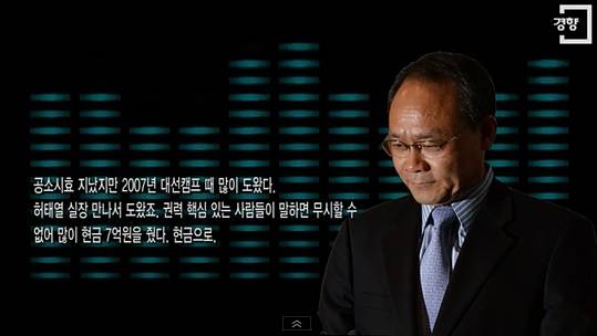 성완종 : 우선 제가. 우리 저 허태열 실장, 국회의원 당시에 제가 만났잖아요. 물론 뭐 공소시효 같은 건 지났지만 2007년 대선 캠프 때 제가 많이 도왔어요. 잘 아시다시피 기업하는 사람들이 권력의 핵심이 될 사람들이 얘길 하면 무시할 수 없잖습니까. 그래서 많이 도왔는데 그때 내가 한 7억, 현금 7억 주고