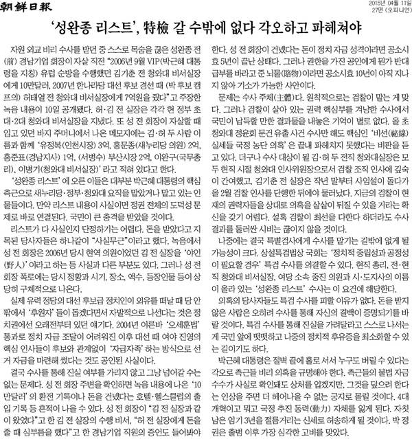 중앙일보도 ‘충격의 ‘성완종 리스트’ 끝까지 밝혀라’ 제목의 사설에서 “전ㆍ현직 비서실장, 국무총리, 친박 실세들이 등장하는 이번 사건을 대하는 청와대와 여권의 대응은 극히 실망스럽다. 하루종일 우왕좌왕할 뿐 이렇다 할 해명을 내놓지 못하고 있다”며 “드러난 의혹은 한 점도 남김없이 모두 가려낸다는 자세로 임해야 할 것”이라고 밝혔다.
