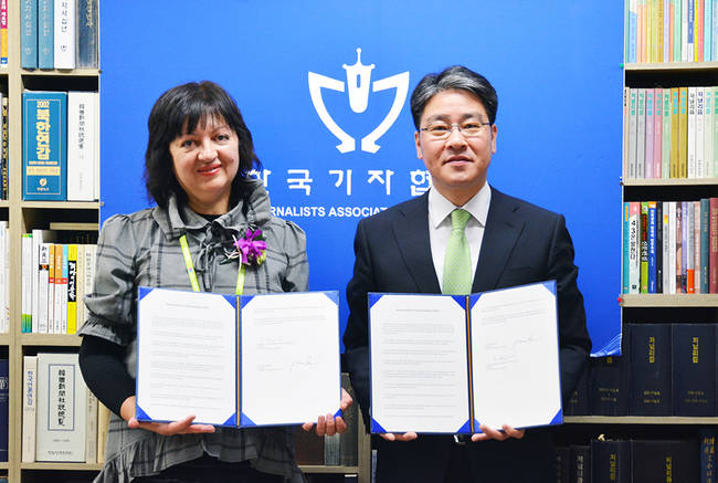 한국기자협회 박종률 회장과 불가리아 기자협회 토도로바 회장은 13일 서울 중구 프레스센터 기자협회 회의실에서 양국의 언론발전과 기자 교류를 위한 협약서에 서명하고 상호 협력을 다짐했다. 양국 기자협회는 매년 5명의 대표단을 선발해 상대국을 방문하기로 했다.