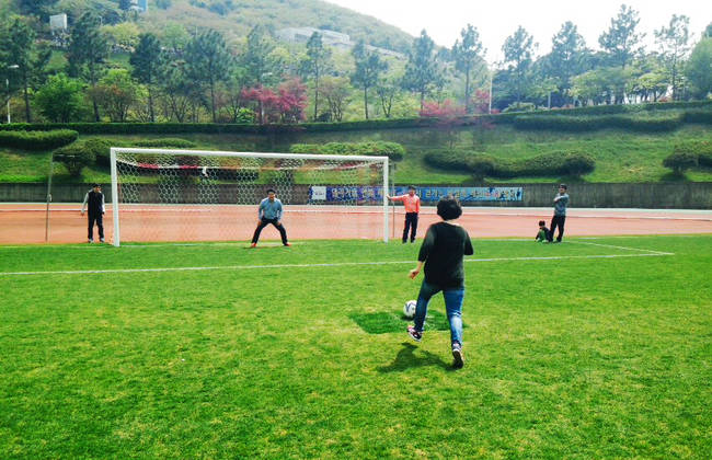 부산기자협회(회장 이은정)가 지난 18일 부산시 동래구 사직운동장에서 체육대회를 열고 축구대회, 단체줄넘기, 승부차기 등의 친선경기를 벌였다. 7개 부산지역 언론사가 참여한 이날 종합우승은 부산일보에 돌아갔다. 사진은 18일 보조구장에서 여기자들이 5명씩 한 팀을 구성하고 데스크가 골키퍼를 맡아 축구 승부차기 경기를 하고 있는 모습. (사진=부산기자협회)