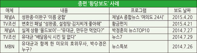 종합편성채널의 ‘성완종 리스트’ 파문 관련 일부 보도가 도마에 오르고 있다. 박근혜 정부 핵심 실세들에게 정치자금을 제공했다는 의혹에 대해 핵심과 관련 없는 내용을 자극적으로 보도하고, 성완종 전 경남기업 회장의 신변잡기를 ‘특종’이라는 자막을 붙여 내보내면서 논란을 부르고 있다.