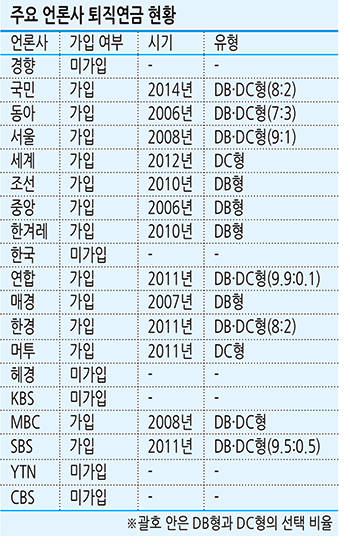 현재 퇴직연금제도에 가입하지 않은 경향신문, 한국일보, KBS, YTN, CBS 등을 제외하고 대부분 언론사들이 DB형 퇴직연금제를 채택했다. 정부가 퇴직연금제 가입을 유도하기 위해 일정 가입률을 넘기면 법인세 인하 등 세제 혜택을 주고 있기 때문이다.
