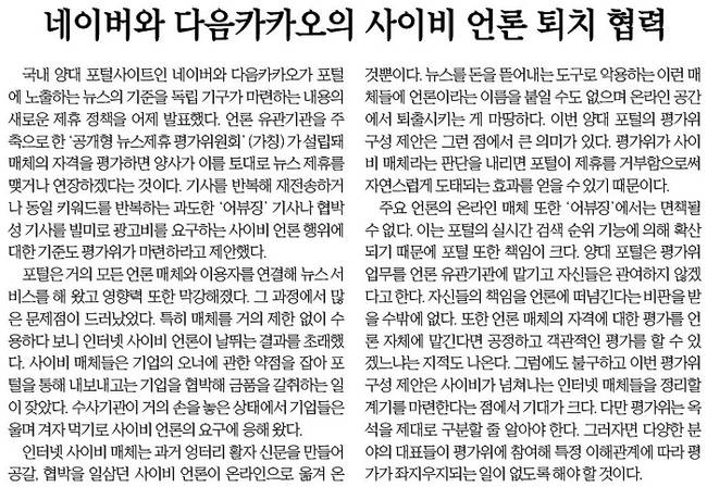 국내 최대 종합 포털인 네이버와 다음카카오가 28일 포털에 게재하는 뉴스 매체 선정과 해지 등을 결정할 독립적인 기구를 운영하자고 제안했다. 국내 언론 관련 단체 및 주요 인사가 모여 평가위원회를 만든 뒤 일부 사이비 언론사를 가려내면, 양사는 이 판단에 따라 포털 사이트의 뉴스 공급자를 정하겠다는 제안이다.