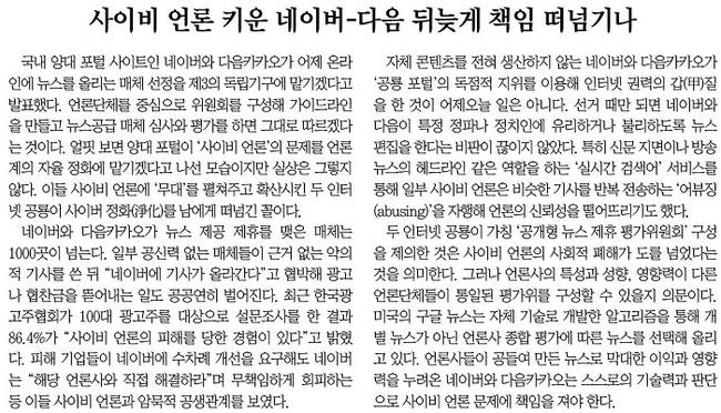 반면 동아일보는 이번 포털의 제안을 부정적으로 바라봤다. 동아일보는 “얼핏 보면 양대 포털이 사이비 언론의 문제를 언론계의 자율 정화에 맡기겠다고 나선 모습이지만 실상은 그렇지 않다”면서 “이들 사이비 언론에 무대를 펼쳐주고 확산시킨 두 인터넷 공룡이 사이버 정화를 남에게 떠넘긴 꼴”이라고 지적했다.