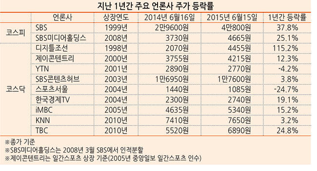 본보가 지난 1년 간 언론사의 주가를 조사한 결과에 따르면 이 기간 동안 코스피(2.4%)나 코스닥(31.7%) 지수 상승률을 웃도는 주식은 SBS, SBS미디어홀딩스, 디지털조선, KNN 등에 불과했다.