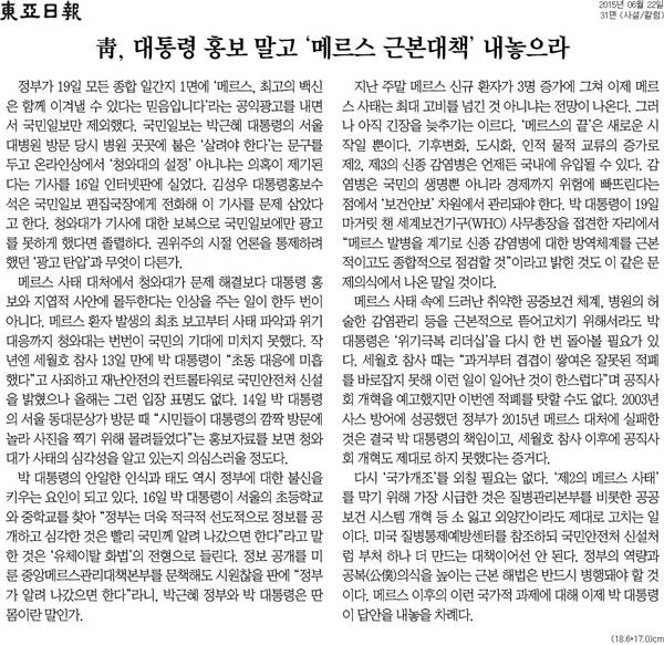 사설은 “메르스 사태 대처에서 청와대가 문제 해결보다 대통령 홍보와 지엽적 사안에 몰두한다는 인상을 주는 일이 한두 번이 아니다”며 “메르스 환자 발생의 최초 보고부터 사태 파악과 위기 대응까지 청와대는 번번이 국민의 기대에 미치지 못했다”고 했다.