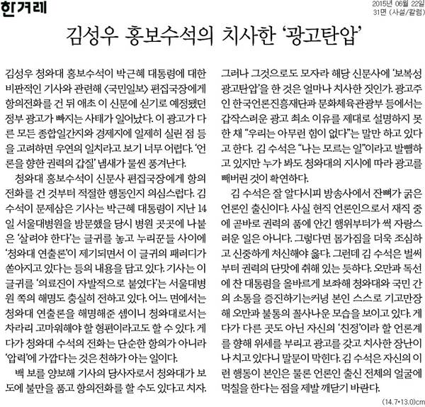 사설은 “김성우 수석이 박 대통령에 대한 비판적인 기사와 관련해 ‘국민일보’ 편집국장에게 항의전화를 건 뒤 애초 이 신문에 싣기로 예정됐던 정부 광고가 빠지는 사태가 일어났다”며 “이 광고가 다른 모든 종합일간지와 경제지에 실린 점 등을 고려하면 우연의 일치라고 보기 어렵다”고 지적했다.