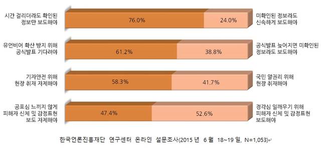 25일 한국언론진흥재단이 발표한 ‘메르스 보도 관련 국민인식 조사’결과에 따르면 ‘시간이 걸리더라도 언론은 확실한 정보를 보도해야 한다’고 답한 응답자는 76%에 달했다.
