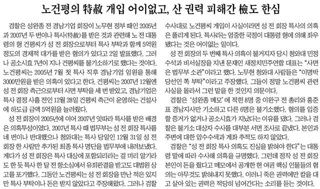 반면 조선일보는 노건평씨가 성 전 회장의 특별사면을 도와준 대가로 5억원을 취한 정황이 드러났다는 점을 강조했다. 조선은 “성 전 회장이 2005년에 이어 2007년 잇따라 특사를 받은 배경은 의혹투성이였다”며 “특사라는 엄중한 국정이 대통령 형에 의해 좌우됐다는 것은 어이없는 일”이라고 했다.