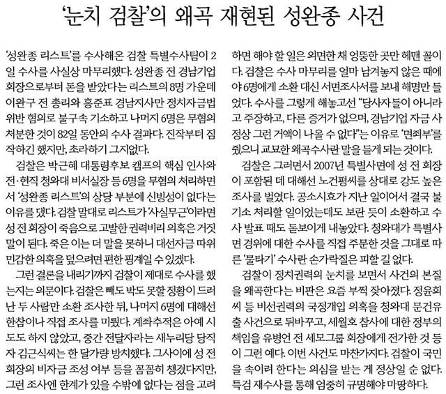 성 전 회장이 지난 4월 목숨을 끊기 전 전화 인터뷰를 했던 경향신문은 “검찰의 ‘최선’을 신뢰할 국민은 없을 것”이라고 일갈했다. 경향은 “박근혜 정부의 정통성에 치면상을 가져올 ‘대선자금’에 관련된 인물에게는 모두 ‘혐의 없음’이라는 면죄부를 준 것”이라며 “이 같은 결과는 특별수사팀이 구성되고 4월28일 박 대통령이 수사 가이드라인을 제시한 것으로 간주할 수 있는 ‘대국민담화’ 발표 때 이미 예고된 것이었다”고 밝혔다.