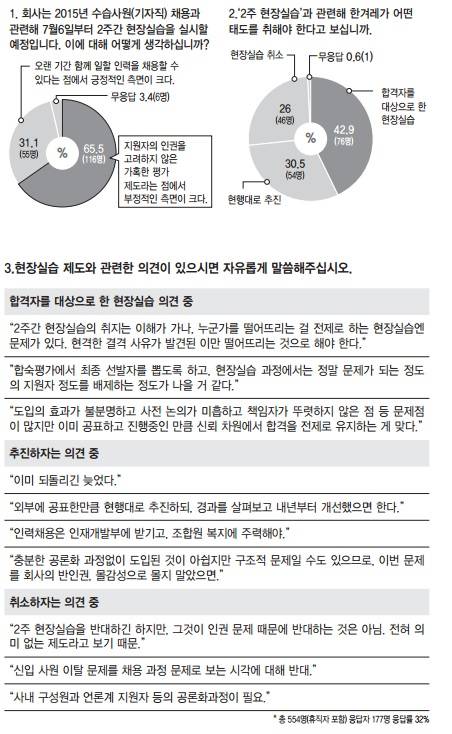 한겨레 노조는 5일 노보를 통해 “5월26일~7월1일 조합원을 대상으로 실시한 설문조사 결과 ‘(2주간 현장실습이) 지원자의 인권을 고려하지 않은 가혹한 평가 제도라는 점에서 부정적인 측면이 크다’는 답변이 117명(65.5%), ‘오랜 기간 함께 일할 인력을 채용할 수 있다는 점에서 긍정적인 측면이 크다’는 의견은 55명(31.1%)이었다”고 밝혔다.