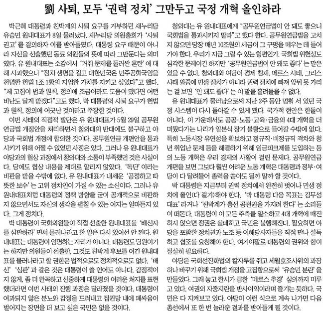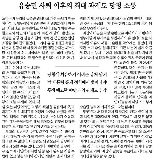 유승민 새누리당 원내대표가 8일 의원총회 권고에 따라 원내대표직에서 물러난 가운데 이날 주요 신문들은 일제히 사설을 통해 박근혜 대통령의 리더십을 비판하는 한편 앞으로의 당·청 관계를 우려했다.
