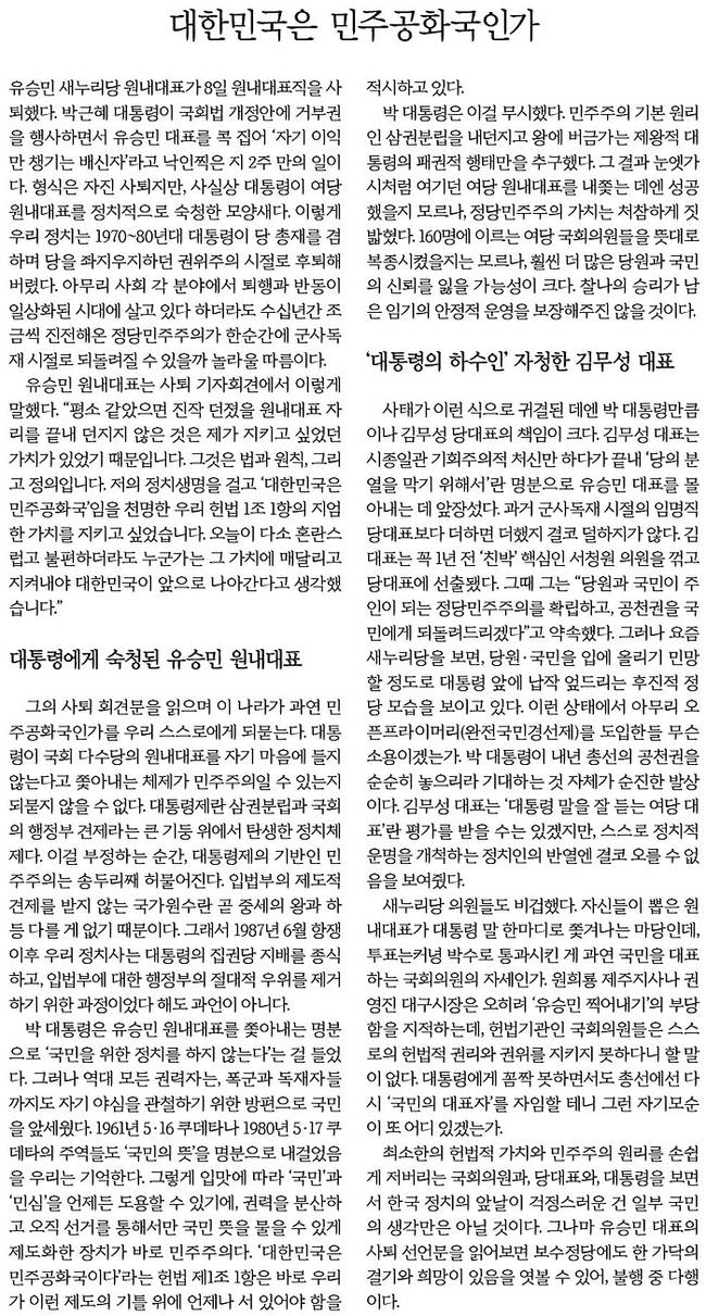 한겨레는 “박 대통령이 민주주의 기본 원리인 삼권분립을 내던지고 왕에 버금가는 제왕적 대통령의 패권적 행태만을 추구했다”며 “그 결과 눈엣가시처럼 여기던 여당 원내대표를 내쫓는 데엔 성공했을지 모르나, 정당민주주의 가치는 처참하게 짓밟혔다. 160여명에 이르는 여당 국회의원을 뜻대로 복종시켰을지는 모르나, 훨씬 더 많은 당원과 국민의 신뢰를 잃을 가능성이 크다”고 지적했다.