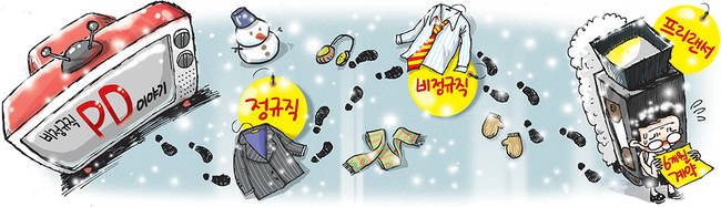 방송사에서는 2년 시한부의 비정규직 인력을 채용하기 시작했다. 매년 뽑아 1년 일한 직원이 신입을 가르치는 식으로 순환되는 시스템이 도입된 곳도 있었다. 2년 근무 후에 능력이 있는 일부 인력은 바우처 형식의 프리랜서로 계약을 이어갔다. 그도 한 방송사에서 6년째 프리랜서로 일하고 있다. 정규직들과 달리 능력을 인정받아야 지속적인 고용을 보장받을 수 있는 슬픈 운명이다.