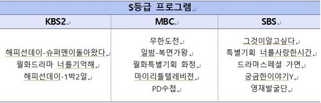 MBC '마이리틀텔레비전'은 처음으로 S등급에 진입했다. KBS2 '너를기억해'는 높지 않은 시청률에도 S등급에 들어 눈길을 끌었다.