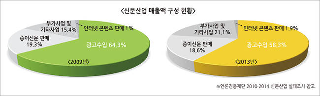 올 초 언론진흥재단에서 발표한 ‘2014 신문산업 실태조사’에 따르면 2013년도 광고수입과 종이신문 판매수입이 전체 신문산업 매출액에서 차지하는 비중은 각각 58.3%, 18.6%로 나타났다. 이는 4년 전보다 광고수입은 6%포인트, 종이신문 판매수입은 0.7%포인트 떨어진 수치다.