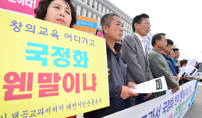 정부·여당이 추진하고 있는 한국사 교과서 국정화를 두고 논란이 지속되고 있다. 여권은 현재 검정 체제가 좌편향 교과서를 양산하고 있다며 국정화를 밀어붙이고 있지만, 야권·시민단체는 독재적 발상이라며 강력하게 저지하겠다는 입장이다.