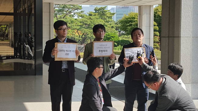 조성래 언론노조 사무처장은 이날 서울 서초동 서울중앙지검 청사 앞에서 기자회견을 열고 “고 이사장이 지난 2009년부터 2년간 사학분쟁조정위원으로 활동하며 김포대학의 임시이사 선임에 관여하고도 임기가 끝난 후 이사선임처분 취소소송을 수행했다”며 “이는 명백한 변호사법 위반”이라고 밝혔다.