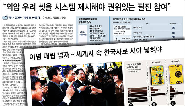 반면 진보 신문들은 보수 진영에서도 국정화 반대 목소리를 내고 있다며 대립각을 세웠다. 한겨레는 20일자 1면에서 “중도·보수 성향의 학자들과 새누리당 의원 등 보수 진영에서도 ‘국정화는 안 된다’는 목소리가 끊이지 않고 있다”며 “역사·교육학계에서는 보수·진보 가릴 것 없이 국정화 반대와 집필 거부에 한목소리를 내고 있다”고 보도했다.