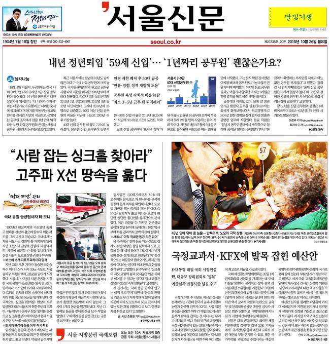 대부분 신문이 교육부의 역사교과서 국정화 비밀 TF 운영을 1면 머리기사로 다룬 것과 대조적으로 서울신문은 관련 사실을 여야가 역사 공방전을 벌이고 있다는 내용의 26일자 9면 기사(야, 박대통령 시정연설 참석..."보이콧 검토 안해")에서 짧게 다뤘다.