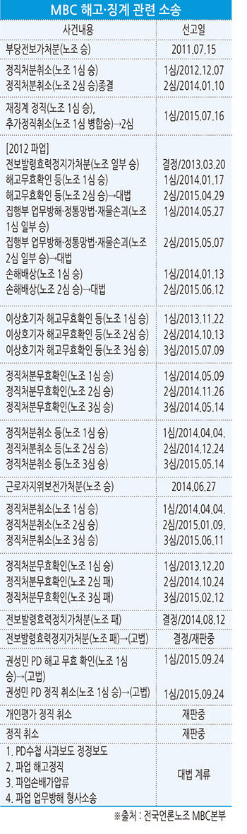 특히 노조는 지난 2012년 파업과 관련한 소송 4건을 모두 승리로 이끌었다. 서울고법은 지난 4월 해고무효확인 소송에서 정영하 등 노조원 6명의 손을 들어줬다. 정직 처분이 내려진 38명의 직원들도 풀려났다. 한 달 후엔 업무방해로 기소된 노조 집행부 5명에 대해 재물손괴 행위 등만 유죄로 인정해 벌금형을 내렸고, 업무방해에 관해선 1,2심 모두 무죄를 선고했다. 또 지난 6월 사측이 제기한 195억원짜리 손해배상 소송에서는 원심에 이어 기각되는 등 연일 노조의 승소가 이어지고 있다. 당시 법원은 노조의 공정방송협의회 개최 요구를 사측이 정당한 이유 없이 수차례 거부한 점, ‘PD수첩’ 제작진을 대거 업무 관련성이 적은 부서로 발령 내는 등 인사권을 남용한 점을 지적했다. 재판부는 “사측은 방송법 등 관계법령 및 단체협약에 의해 인정된 공정방송 의무를 위반했을 뿐 아니라 그 구성원인 다수 근로자들의 구체적인 근로환경을 악화시켰다 할 수 있다”며 “근로자들은 그 시정을 구하기 위한 쟁의행위에 나아갈 수 있다”고 판시했다. 노조는 “1심 재판부에 이어 항소심 재판부도 하나같이 공정방송에 대한 요구가 MBC 노조의 파업의 이유로 정당하다고 판결했다”며 “사측이 내부 구성원들에게 본보기를 보여주고, 앞으로도 해고·징계를 맘대로 일삼고자 소송에 집착하는 것”이라고 비판했다.