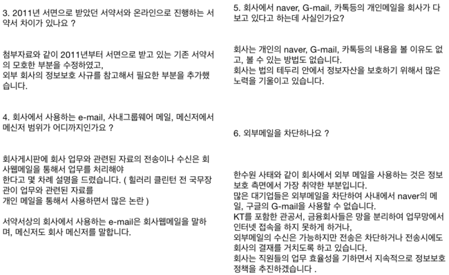 사측은 노조와의 질의응답을 통해 “회사는 개인의 naver, G-mail, 카톡 등의 내용을 볼 이유도 없고 볼 수 있는 방법도 없다”며 “서약서상의 회사에서 사용하는 e-mail과 메신저는 모두 회사웹메일과 회사메신저를 말하는 것”이라고 강조했다.
