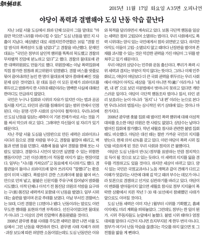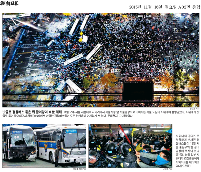조선일보는 16일자 <대한민국 심장부 무법천지 7시간> <쇠파이프, 횃불, 경찰버스 폭파시도...공권력을 조롱하다>라는 제목의 기사를 통해 “서울 세종대로 등 도심 일대는 폭력이 난무한 시위대의 해방구였다”며 비판을 쏟아냈다. 조선은 “시위대가 자정까지 경찰이 설치한 버스 차벽을 밧줄로 끌어당겨 무너뜨리고 쇠파이프와 사다리로 경찰 버스를 때려 부수는 등 공권력을 마음껏 조롱했다”고 보도했다. 2면에는 시위 현장에 있는 소주병과 음식물 등을 사진에 담아 “술기운이 오른 한 시위 참가자가 동료 앞에서 쇠파이프를 휘두르며 경찰을 때리는 시늉을 하기도 했다”며 아수라장인 시위 현장을 부각시키기도 했다.