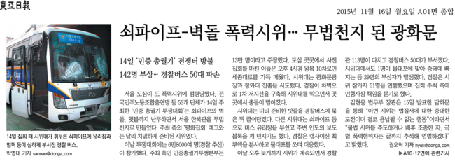 동아일보도 17일 <문재인의 이중잣대>라는 제목의 기사를 통해 시위대를 두둔하는 야당의 모습을 비판했다. 동아는 “9년 전 청와대 수석 땐 폴리스라인을 지켜야 한다고 하더니 이제 와서 광화문 폭력시위에는 경찰진압이 부당하다는 주장만 하고 있다”고 보도했다. 이전날인 16일엔 시위대의 폭력성에 주목했다.
