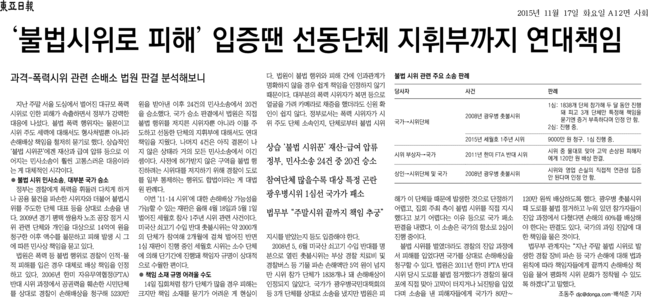 동아는 또 폭력시위와 관련한 손배소 판결을 분석한 기획기사를 내놓기도 했다. <불법시위로 피해 입증땐 선동단체 지휘부까지 연대책임>이라는 제목의 기사에는 정부가 그동안 시위자들에게 재산과 급여 압류 등 민사소송을 통해 대응했단 점이 담겼다.