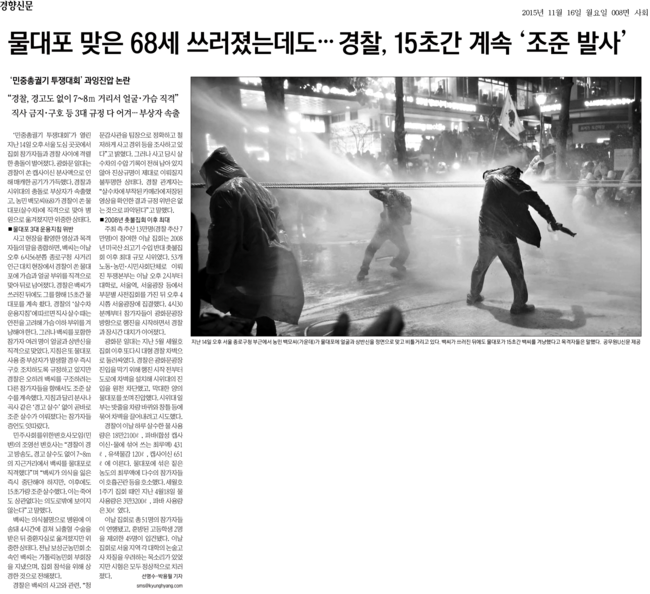반면 진보 언론들은 경찰의 진압과정의 위법성과 과잉대응에 초점을 맞췄다. 특히 경향신문은 물대포에 맞아 실려간 60대 노인의 사연을 집중적으로 보도하며 경찰의 과잉대응의 부당함을 호소했다.