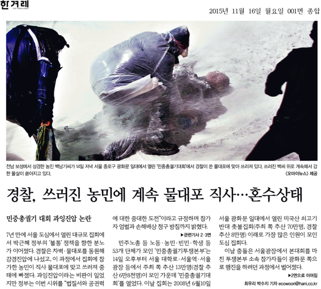 한겨레는 17일에도 1면과 2면에서 <안전규정도 안 지키고 경찰 물대포 마구 쐈다>, <헌재 작년에 "물대포 직사 반복될 가능성 없다"더니>라는 제목의 기사를 통해 정부와 경찰의 과잉 대응을 비판했다.
