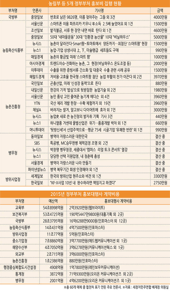 실제로 본지가 입수한 ‘2015년 정부부처 홍보대행사 계약 현황’ 자료를 보면 교육부와 보건복지부, 외교부, 해양수산부, 중소기업청, 통계청 등 12곳은 올해 홍보대행사와 300억원대의 신규 계약을 맺었다. 농림축산식품부는 지난 9월 4억7500만원에, 방위사업청은 5억원에 홍보대행사 인포마스터와 계약을 맺었다. 올해 예산이 2001억원인 병무청은 4억6200만원을 홍보대행사 계약금으로 지출했다. 병무청의 계약 이후 SBS와 동아일보, 서울경제 등 언론사들은 ‘특공병, MC승무헌병 체력검정 조명’, ‘병역이 자랑스러운 대한민국’, ‘병역 복무기간 희생 인정해야’ 등 군과 관련한 기사들을 쏟아냈다. 대행사가 발빠르게 언론사에 접촉해 협찬기사를 따낸 것.