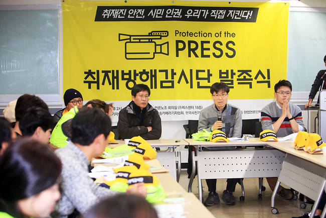 지난 5일 2차 민중총궐기 집회에 초록색 조끼와 노란색 모자를 착용한 이들이 등장했다. 전국언론노조와 한국기자협회, 방송기자연합회 등 현업언론단체와 시민단체들이 공권력의 언론 취재 방해와 시민들에 대한 인권침해를 감시하겠다는 취지로 지난 1일 출범한 취재방해감시단이었다. 30여명 규모의 감시단은 이날 10여개조로 편성돼 자사 취재팀을 동행 감시하거나 행렬 선두, 서울대 병원 앞 등 집회 장소 곳곳에 배치돼 현장 상황을 기록하고 감시했다.