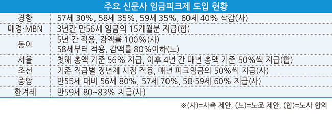 한 신문사 차장급 기자는 “은퇴를 앞둔 선배들이 일을 열심히 하지 않는다는 여론도 있지만, 후배들 역시 선배들처럼 30년 동안 다닐 수 있도록 회사를 지속가능한 시스템으로 만들기 위해서라도 임금피크제 도입을 신중히 접근했어야 했다”고 지적했다.