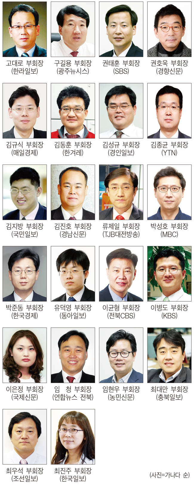 부회장에는 고대로(한라일보), 구길용(광주뉴시스), 권태훈(SBS), 권호욱(경향신문), 김규식(매일경제신문), 김동훈(한겨레신문), 김성규(경인일보), 김종균(YTN), 김지방(국민일보), 김진호(경남신문), 류제일(TJB대전방송), 박성호(MBC), 박준동(한국경제신문), 유덕영(동아일보), 이균형(전북CBS), 이병도(KBS), 이은정(국제신문), 임청(연합뉴스 전북), 임현우(농민신문), 최대만(충북일보), 최우석(조선일보), 최진주(한국일보) 기자가 임명됐다.