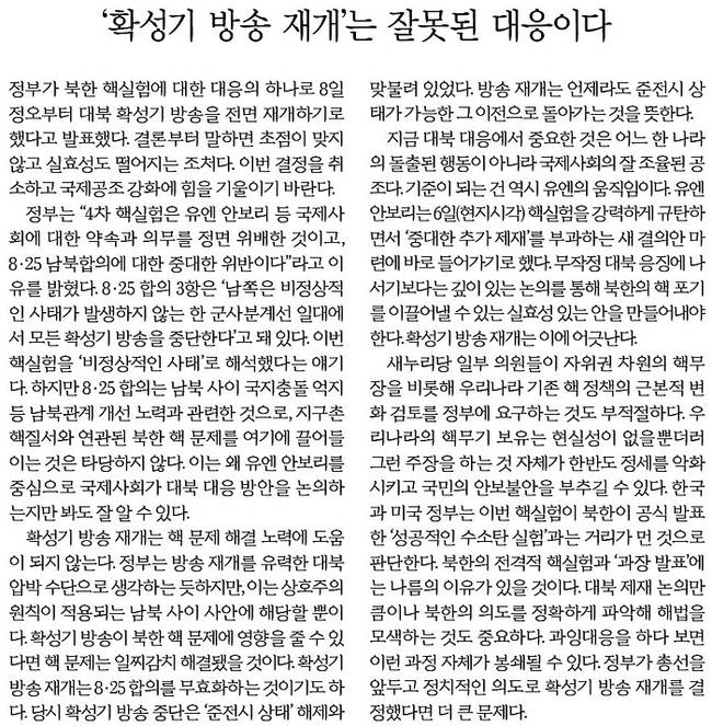 경향신문도 확성기 방송 재개가 북핵을 막을 수단이 아니라고 지적했다. 경향신문은 “정부가 대북확성기 방송을 재개하기로 했지만 이것이 북핵을 막을 수단이 아니라는 사실은 삼척동자도 알 것”이라며 “북한의 4차 핵실험이 한반도와 동북아에 위기를 몰고 왔지만 어디까지나 북핵 문제의 평화적이고 외교적인 해결 원칙을 잊지 말아야 한다”고 주장했다.