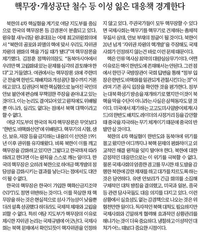 경향신문은 “북한에 대한 감정적인 대응만으로는 이 위기를 극복할 수 없다. 유엔 안보리가 긴급회의를 소집해 구체적인 대처 방침을 결의했고, 미국과 일본, 중국 등 관련 당사국들도 대응 의지를 다지고 있는 상황에서 실효성도 없는 강경책으로 나오는 것은 위험천만한 일”이라며 “독자적인 북핵 대처도 필요하지만 국제사회와 긴밀하게 협력해 효과적인 상황관리를 해나가는 것이 더욱 중요하다. 냉철하고 이성적인 대처가 어느 때보다 중요한 시점”이라고 강조했다.