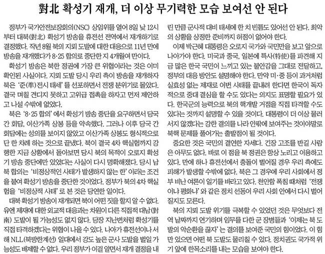 반면 조선일보는 더 이상 무기력한 모습을 보이면 안 된다며 확성기 방송을 재개해야 한다고 주장했다.