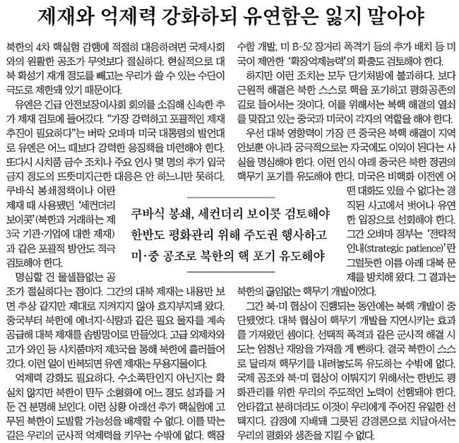 중앙일보는 “북한의 4차 핵실험 감행에 적절히 대응하려면 국제사회와의 원활한 공조가 무엇보다 절실하다”면서 “유엔은 어느 때보다 강력한 응징책을 마련해야 한다. 쿠바식 봉쇄정책이나 이란 제재 때 사용됐던 ‘세컨더리 보이콧’(북한과 거래하는 제3국 기관·기업에 대한 제재)과 같은 포괄적 방안도 적극 검토해야 한다”고 주장했다.